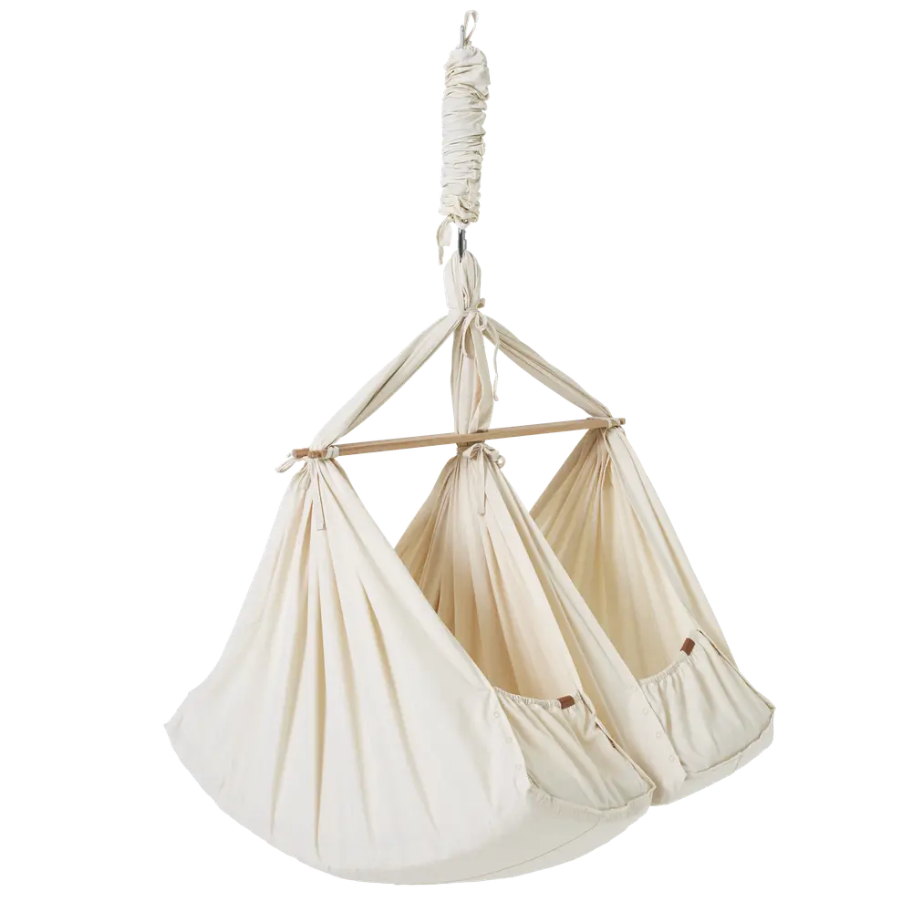 Tvillingeslyngevuggen er lavet af super blød og slidstæk økologisk bomuld og kommer med madras med fyld af 100% ren uld med 100% økologisk bomuldsbetræk, lagen i blødt økologisk bomuld og med et fint broderi af lukkede øjne, to baldakiner/myggenet og fjed